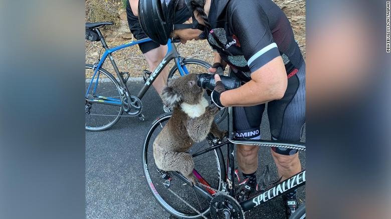 Cyclist helping thirsty Koala